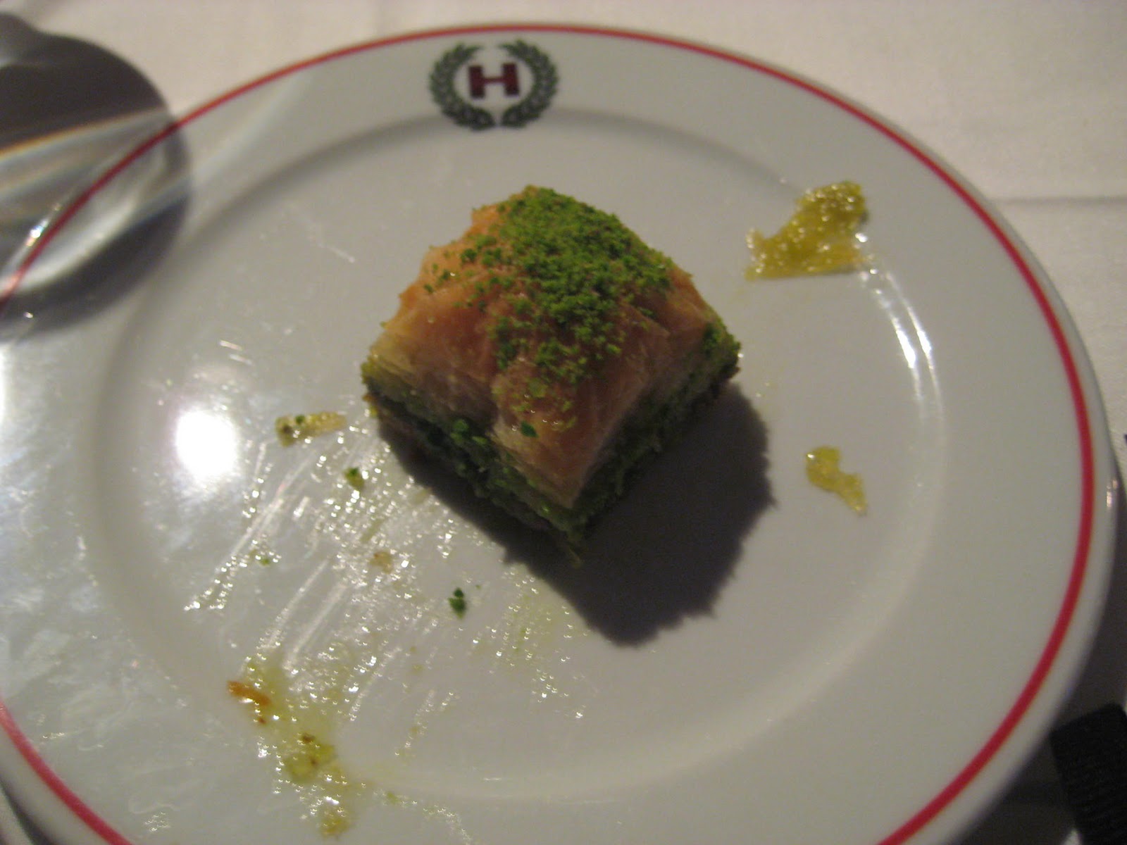 Baklava:doce de massa folhada tipo filo, coberto com calda de açúcar com água de rosas e pistache moído (dizem que não importa o que gregos e árabes digam, as baklavas são turcas!)